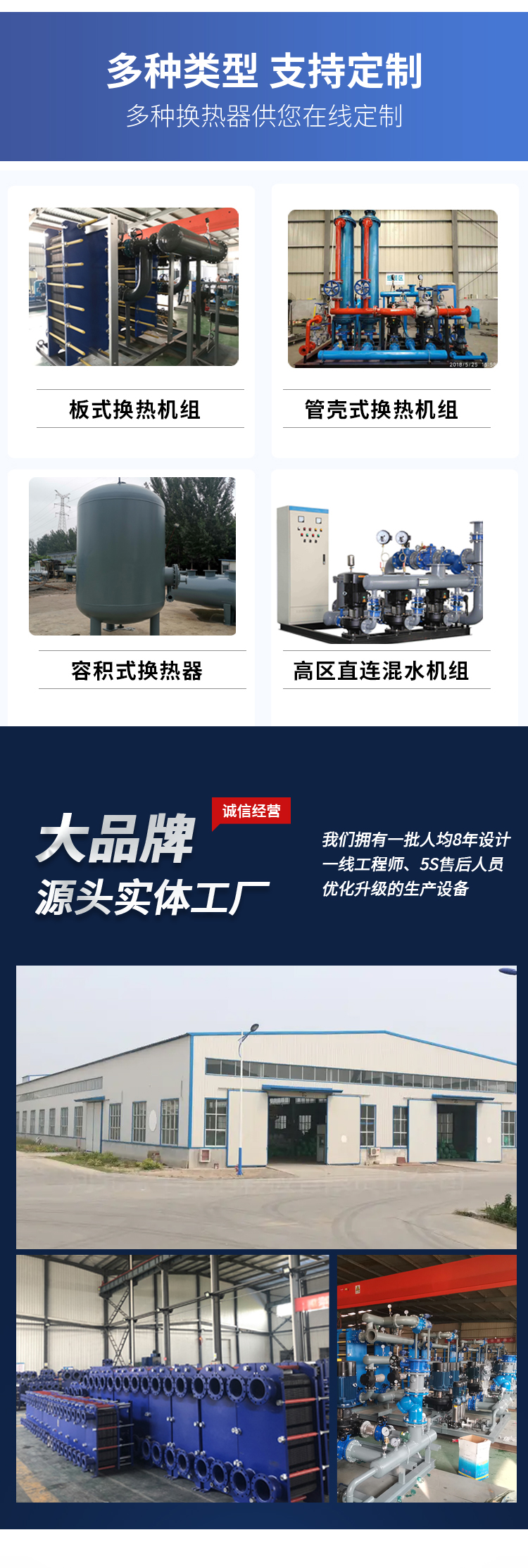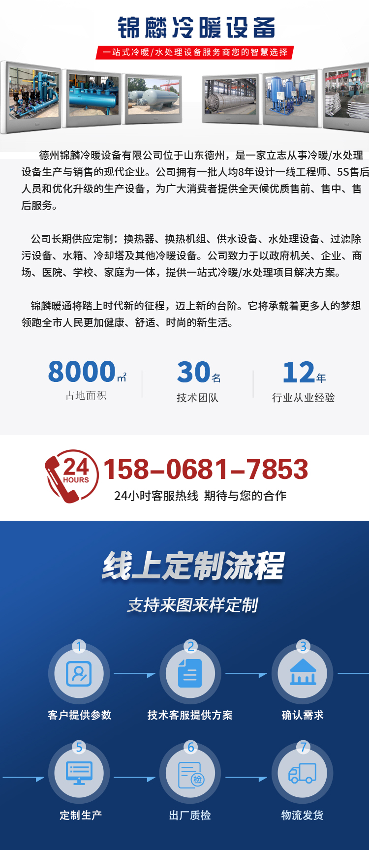 公司長期供應定制:換熱器、換熱機組、供水設備、水處理設備、過濾除污設備、水箱、冷卻塔及其他冷暖設備。公司致力于以政府機關、企業、商場、醫院、學校、家庭為一體,提供一站式冷暖/水處理項目解決方案。